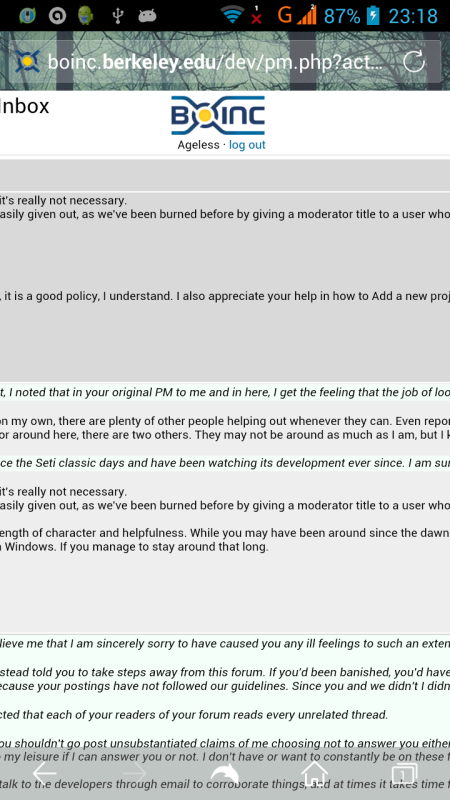 Sorry, I only posted this to David yesterday. "the problem only happens in Private Messages. E.g. this post at Seti https://setiathome.berkeley.edu/forum_thread.php?id=76697&postid=1639743 has a start log that scrolls separately from the rest of the text in the thread, and does so both on my phone and my PC.
