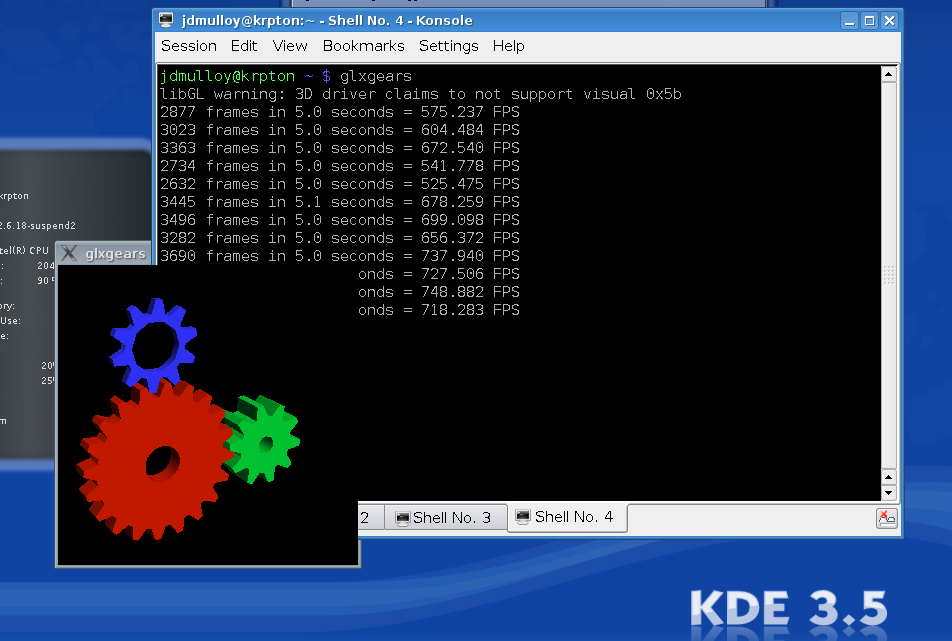 This screenshot shows glxgears running behind Konsole with xcompmgr running,