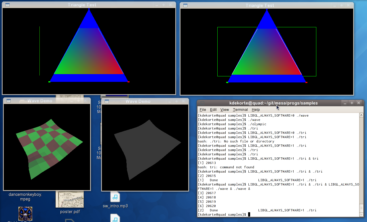 I ran the progs/samples/tri and progs/samples/wave mesa examples in software
