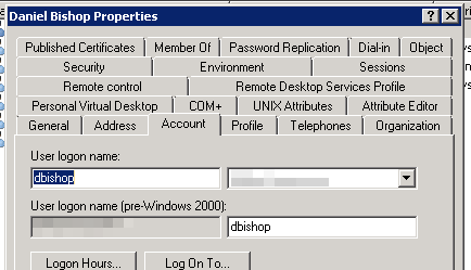 Am Mittwoch, 23. Juli 2014 18:18:49 UTC+2 schrieb Daniel Bishop: > > Do you have access to the Active Directory Users & Computers tool? > > If so, what does the *Account* tab look like for your users? > > <https://i.cloudup.com/rGuM4w8kA3.png> > i.e.: > > The other place to look would be the *sAMAccountName* in the *Attribute* > Editor tab. > > Try using one of those entries instead of a username w/ a space in it? > > > > On Wednesday, July 23, 2014 6:06:16 AM UTC-7, Sven Timmermann wrote: >> >> Hi, >> >> no one any idea? :( >> >> Am Freitag, 11. Juli 2014 12:25:50 UTC+2 schrieb Sven Timmermann: >>> >>> Hi everyone, >>> >>> i've here a problem with the ldap connection. >>> >>> In the environment we Use "first name last name" as login name, yep with >>> a space :( >>> >>> And know i become the following error: Could not authorize you from LDAP >>> because "Validation failed: username only letters, digits & ' ' '-' '.' >>> allowed. letter should be first". >>> >>> When i use a the User "test_account" it works perfectly, but when is use >>> "test account" it don't work... >>> >>> any idea? >>> >>> Components >>> >>> GitLab 7.0.0 >>> >>> GitLab Shell 1.9.6 >>> >>> GitLab API v3 >>> >>> Ruby 2.1.1p76 >>> >>> Rails 4.1.1 >>> >>> Best regards Sven >>> >> -- You received this message because you are subscribed to the Google Groups "GitLab" group. To unsubscribe from this group and stop receiving emails from it, send an email to [email protected]. To view this discussion on the web visit https://groups.google.com/d/msgid/gitlabhq/2bd78109-9a6a-4303-8a08-8db51139e0d6%40googlegroups.com. For more options, visit https://groups.google.com/d/optout.