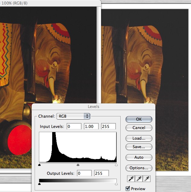 Cute to see all those big toys! I'd say a few of 'em were lightened up too much - there's no black left in the shot when it's clear that there was darkness/black in the original scene. (Clue: In the histograms of the outdoor night shots, you'd expect the curve to hit the left end (or at least get very close) indicating that there is stuff in the photo that represents BLACK) Well crud. Now that I have typed all of that, I pulled down a copy that I could pull up in Photoshop and show the funkiness of the histogram - and it's displaying much darker in Photoshop than it is on my display in Firefox. (This is on a MAC for those who care or if it matters) Anyone know what gives there? Below is a link that shows the difference I'm seeing - on the left- hand side is a fraction of the file from within Photoshop, overlaid with the histogram from (again) Photoshop. On the right half is the Firefox screen that is right below Photoshop, and it is noticeably brighter/lighter. Washed-out, even. http://charles.robinsontwins.org/images/elephant.jpg -Charles -- Charles Robinson [EMAIL PROTECTED] Minneapolis, MN http://charles.robinsontwins.org -- PDML Pentax-Discuss Mail List [email protected] http://pdml.net/mailman/listinfo/pdml_pdml.net