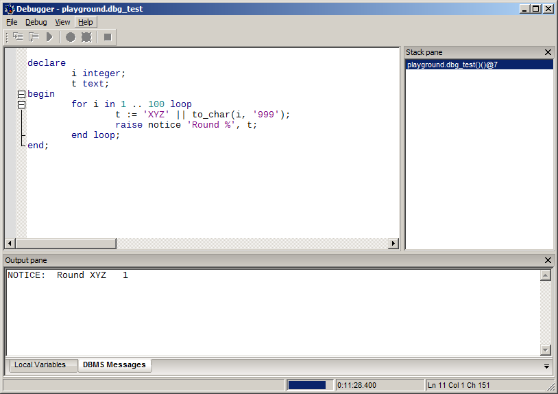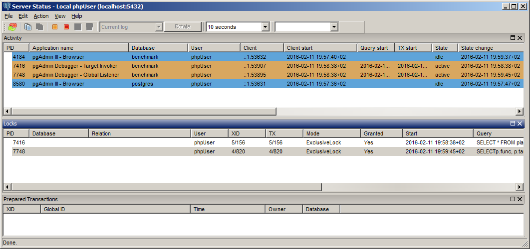 create function playground.dbg_test() returns void as $$ declare i integer; t text; begin for i in 1 .. 100 loop t := 'XYZ' || to_char(i, '999'); raise notice 'Round %', t; end loop; end; $$ language plpgsql; Right-click the function in Object browser then debug. Step a few times through the loop then take some time doing other things in pgadmin iii (browse data, run queries etc.) then return to the debug window and step again a few times. The debug window usually freezes (debug.png). Two locks remain (server status.png). The server may be cleared by cancelling the query of the global listener (pid 7748 in the example) but then pgadmin windows stop responding. This is preventing me from using the debugger and I need it badly. Thank you for the great job you are doing. Sincerely, Stefan